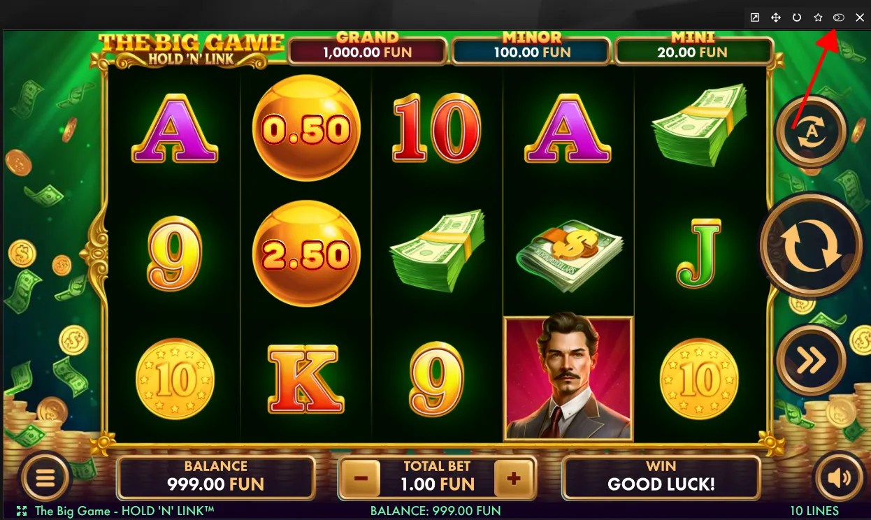 डेमो संस्करण वर्चुअल क्रेडिट पर रील घुमाने देता है, सभी फ़ंक्शनों, आरटीपी और वोलैटिलिटी को बनाए रखते हुए। ‘फ्री-प्ले’ सक्रिय करने के लिए: