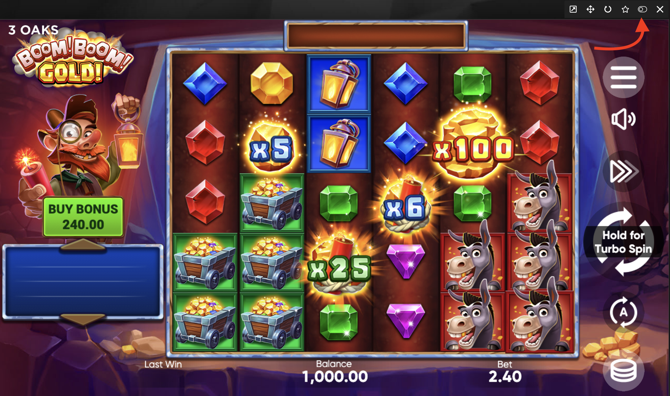 Boom! Boom! Gold! is a vibrant video slot from 3 Oaks Gaming that transports players deep into a gold mine where the roar of dynamite, the clang of pickaxes, and the glow of lanterns create the atmosphere of a true gold rush. The developer combines modern Pay Anywhere mechanics with several progressive multipliers, turning every successful cluster into a real “golden” explosion on your balance. The graphics delight with rich 3D elements: sparkling gems, animated mining carts, and charming miner donkeys come alive on the screen, while the soundtrack adds the feeling of anticipation for a big treasure.